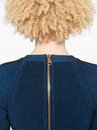ribbed-knit dress Highlights - This elegant short-sleeve ribbed knit dress by balmain is crafted in a electric blue shade. featuring a fitted silhouette, it flares gently at the hem for a flattering look. the back showcases a bold gold-tone zip detail, adding a modern edge to the design. a versatile and stylish choice for both daytime and evening wear. made in italy color: electric bluecare instructions: machine wash on a cold gentle cycle Made in Italy Composition Viscose 67%, Polyester 33% SIZE & FIT Model measurements Height 5 ft 9 in(1.75 m) Bust/Chest 34.64 in(88 cm) Hips 36.61 in(93 cm) Waist 26.37 in(67 cm) FittingInformation Designed for a close fit throughout Slightly short in length; consider your own measurements Made with a midweight knit, this piece offers some stretch