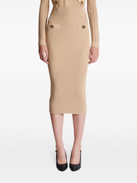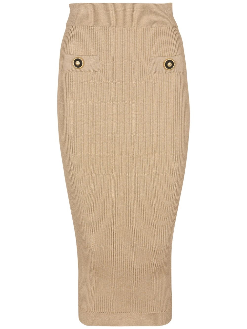 ribbed skirt Highlights - Sand beige - Stretch-design - Decorative button detailing - Elasticated waistband - Fine ribbed - Straight hem Made in Italy Composition Viscose 84%, Polyester 16% SIZE & FIT FittingInformation This midi-length skirt is intended to be worn high on the waist The elasticated waist allows for a comfortable fit Made with a midweight knit, this piece offers some stretch