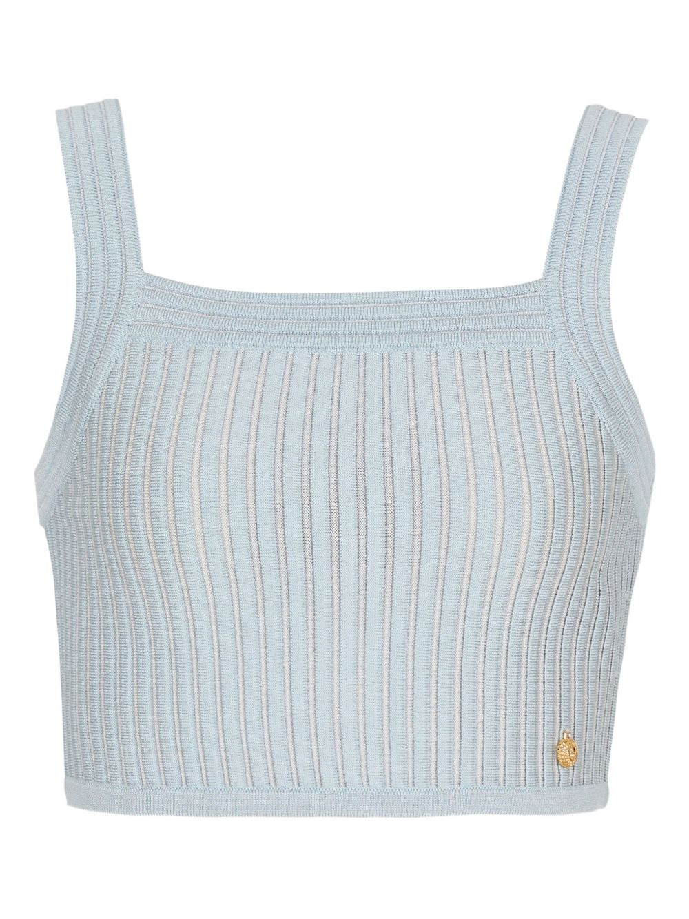 ribbed square-neck top Highlights - Blue - Ribbed knit - Square neckline - Sleeveless - Zip fastening - Gold-tone logo Made in Italy Composition Viscose 83%, Polyester 15%, Polyamide 2% Washing instructions Read Manufacturer Guidelines