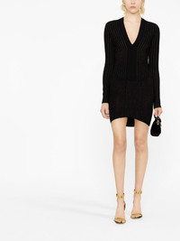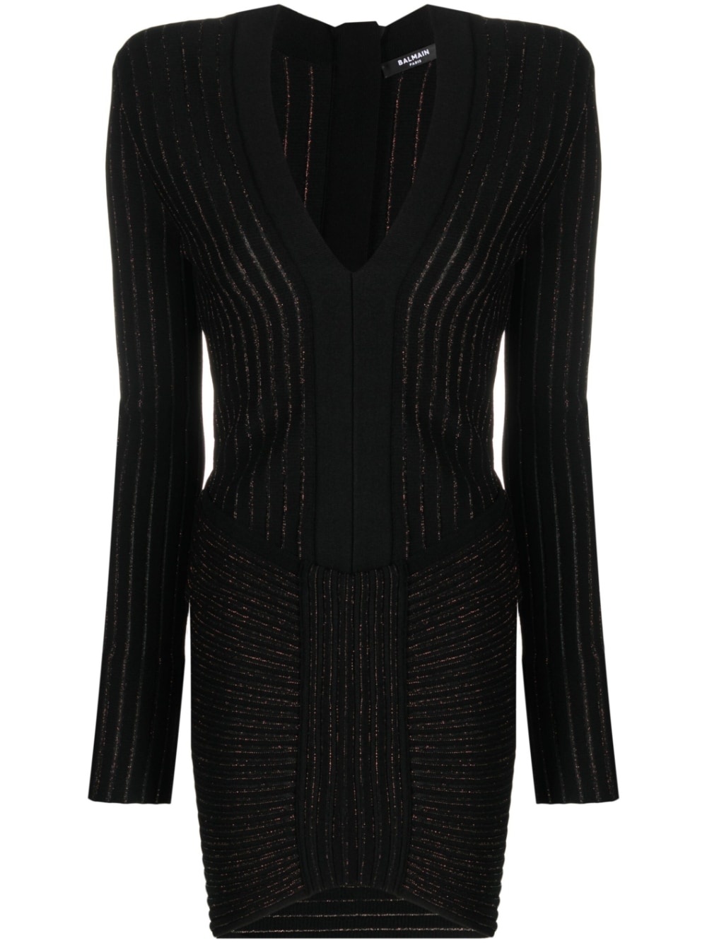 ribbed V-neck mini dress Balmain is renowned for its sculptural silhouettes, as showcased by this black figure-hugging dress. It's characterised by multi-way ribbing that's enhanced with metallic threads. Highlights - Black - Ribbed detailing - Stretch-design - V-neck - Long sleeves - Rear zip fastening - Thigh-length - Curved hem Made in Italy Composition Viscose 83%, Polyester 17% SIZE & FIT Model measurements Height 5 ft 10 in(1.79 m) Bust/Chest 31.49 in(80 cm) Hips 35.03 in(89 cm) Waist 23.62 in(60 cm) FittingInformation Designed for a close fit throughout Made from a midweight non-stretch fabric, this piece offers minimal elasticity when worn This piece fits true to size – take your usual size