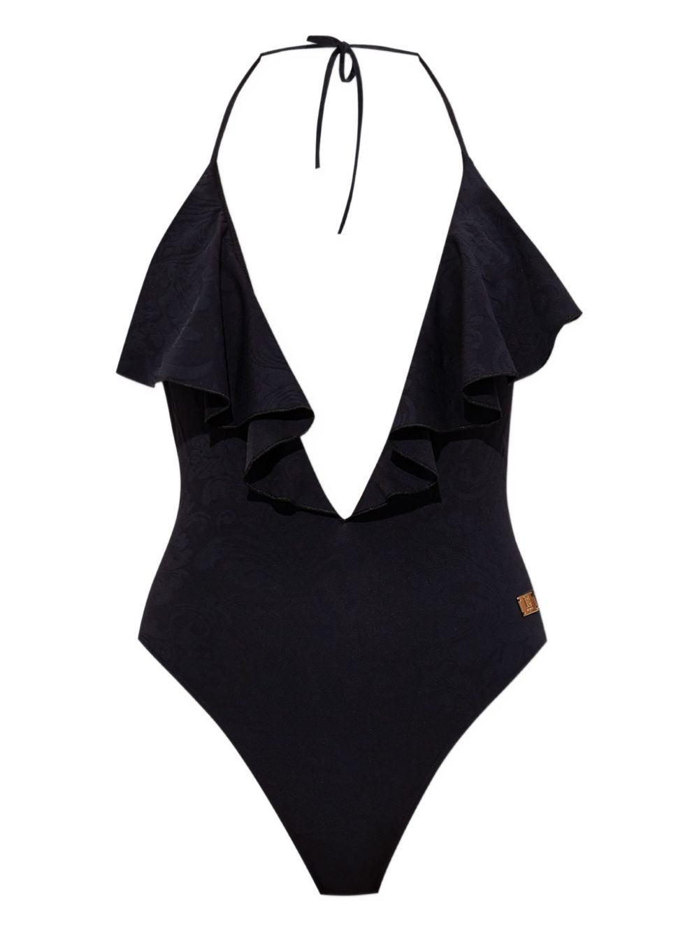ruffled halterneck swimsuit Highlights - Black - Plunging halterneck - Rear tie fastening - Ruffled detailing - Logo plaque - Be mindful to try on swimwear over your own garments. Made in Italy Composition Polyamide 82%, Elastane 18% Washing instructions Read Manufacturer Guidelines