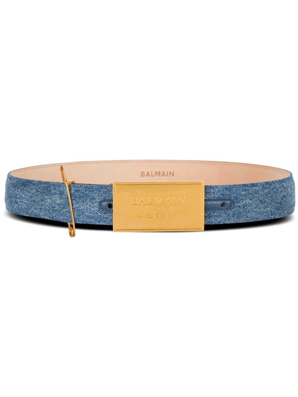 safety-pin denim belt Highlights - Blue - Cotton - Denim - Safety pin detail - Logo-buckle fastening - Gold-tone hardware - Adjustable fit Made in Italy Composition Cotton 100% SIZE & FIT Measurement WIDTH 1.37 in(3.5 cm)