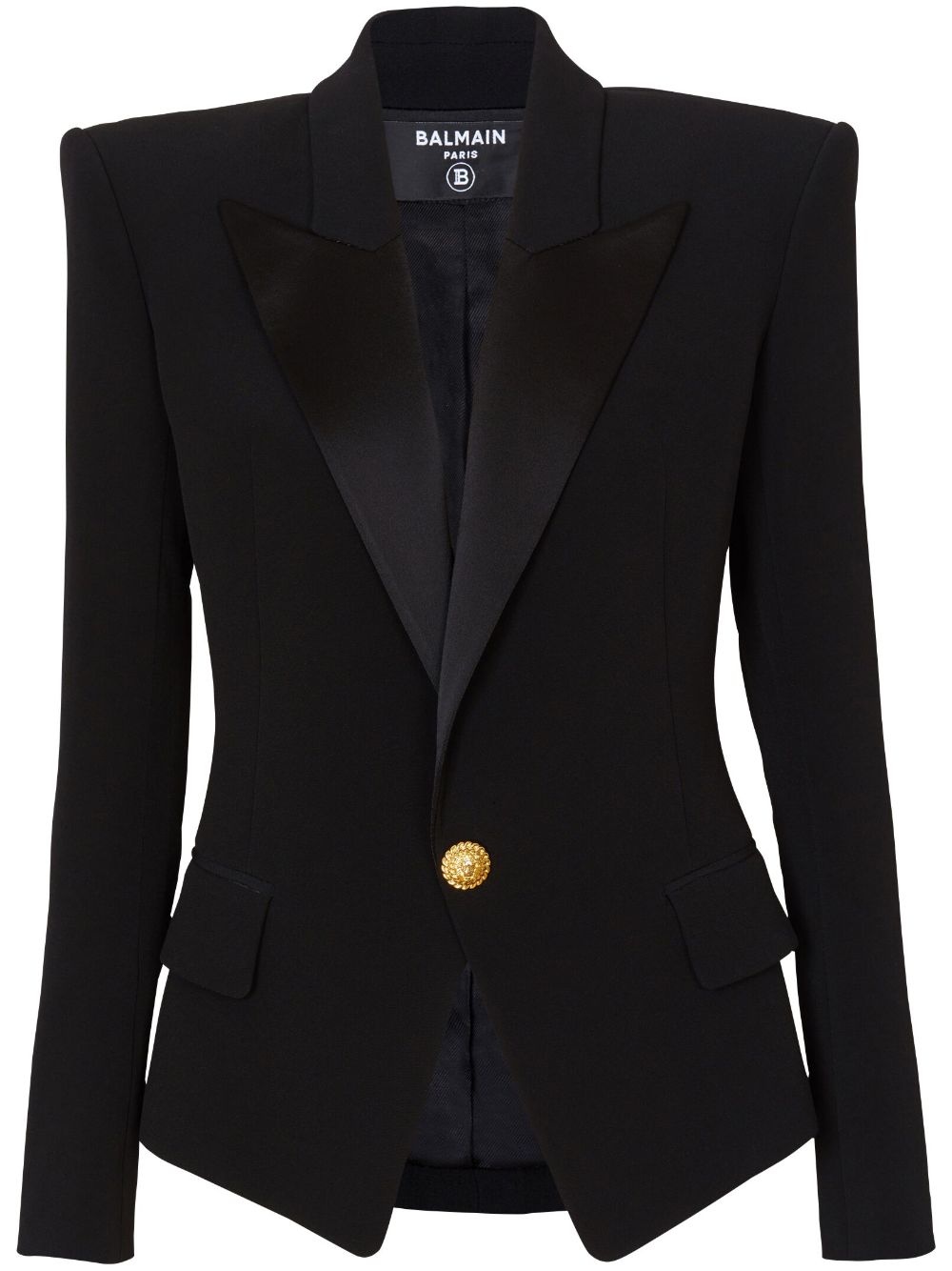 satin-lapel single-breasted blazer Balmain is renowned for its tailored aesthetic, as seen with this blazer. It's defined by sharp lines and sleek satin lapels. Highlights - Black - Crepe texture - Satin trim - Peak lapels - Shoulder pads - Front button fastening - Embossed gold-tone buttons - Two side flap pockets - Long sleeves Imported Composition Viscose 100% SIZE & FIT Measurement SLEEVE LENGTH 30.7 in(78 cm) LENGTH 23.22 in(59 cm) WAIST 33.07 in(84 cm) BUST 37.79 in(96 cm) Shoulder Width 16.53 in(42 cm) Washing instructions Read Manufacturer Guidelines