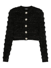 sequin-embellished cardigan Highlights - Black - Sequin embellishment - Button fastening - Long sleeves - Textured knit - Cropped Made in France Composition Viscose 44%, Polyamide 34%, Polyacrylic 10%, Mohair 6%, Cotton 4%, Elastane 1%, Wool 1% SIZE & FIT Model measurements Height 5 ft 10 in(1.78 m) Bust/Chest 33.85 in(86 cm) Hips 36.61 in(93 cm) Waist 26.77 in(68 cm) Washing instructions Dry Clean Only