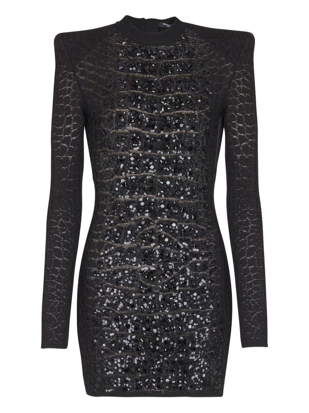 sequin-embellished knit mini dress Highlights - Black - Crocodile texture - Sequin embellishment - Long sleeves - High neckline - Concealed zip fastening Made in France Composition Viscose 80%, Polyester 12%, Polyamide 7%, Elastane 1% Washing instructions Read Manufacturer Guidelines