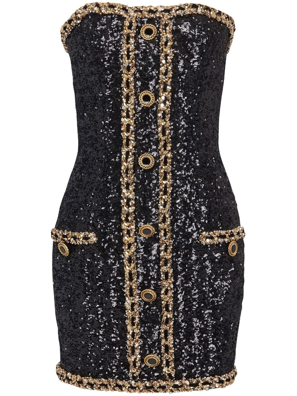 sequin-embellishment bustier minidress Highlights - Black - Sequin embellishment - Bustier-style neckline - Rear zip fastening - Decorative button detailing - Front patch pocket - Fitted waistline - Strapless - Straight hem Imported Composition Body: Polyamide 97%, Elastane 3% SIZE & FIT Measurement HIPS 33.07 in(84 cm) LENGTH 23.22 in(59 cm) WAIST 25.19 in(64 cm) BUST 28.34 in(72 cm)