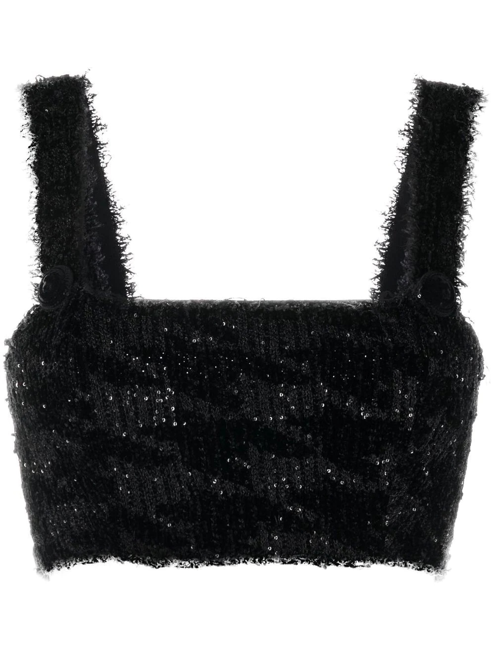 sequin knitted crop top Balmain marries their signature knitted tweed fabric with a contemporary cropped silhouette to realise this black sequin top. Made in France Composition Fabric 100% SIZE & FIT Model measurements Height 5 ft 9 in(1.76 m) Bust/Chest 33.07 in(84 cm) Hips 34.64 in(88 cm) Waist 25.59 in(65 cm) Washing instructions Dry Clean Only