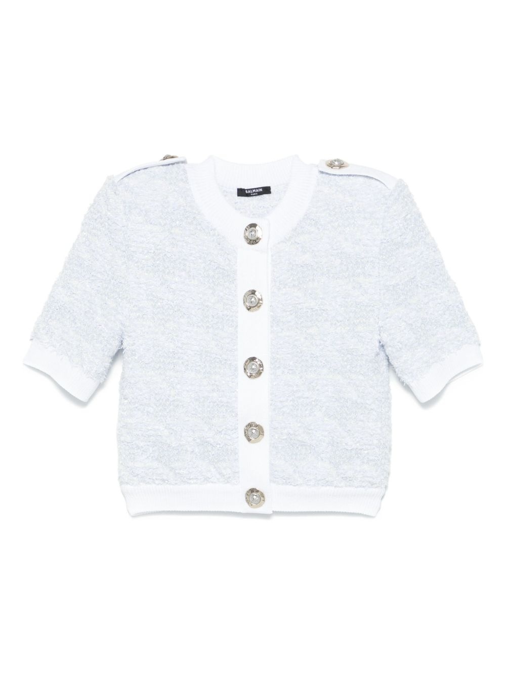 short-sleeve tweed cardigan Highlights - Light blue - Front button fastening - Epaulettes - Crew neck - Ribbed trim Made in France Composition Outer: Polyamide 66%, Viscose 16%, Cotton 13%, Metallized Polyester 2% Lining: Polyester 100% SIZE & FIT Model measurements Height 5 ft 9 in(1.75 m) Bust/Chest 34.64 in(88 cm) Hips 36.61 in(93 cm) Waist 26.37 in(67 cm) FittingInformation Designed for a slim fit that sits just away from the body offering a close yet comfortable fit The internal shoulder pads offer a structured shape Made with a midweight knit, this piece offers some stretch