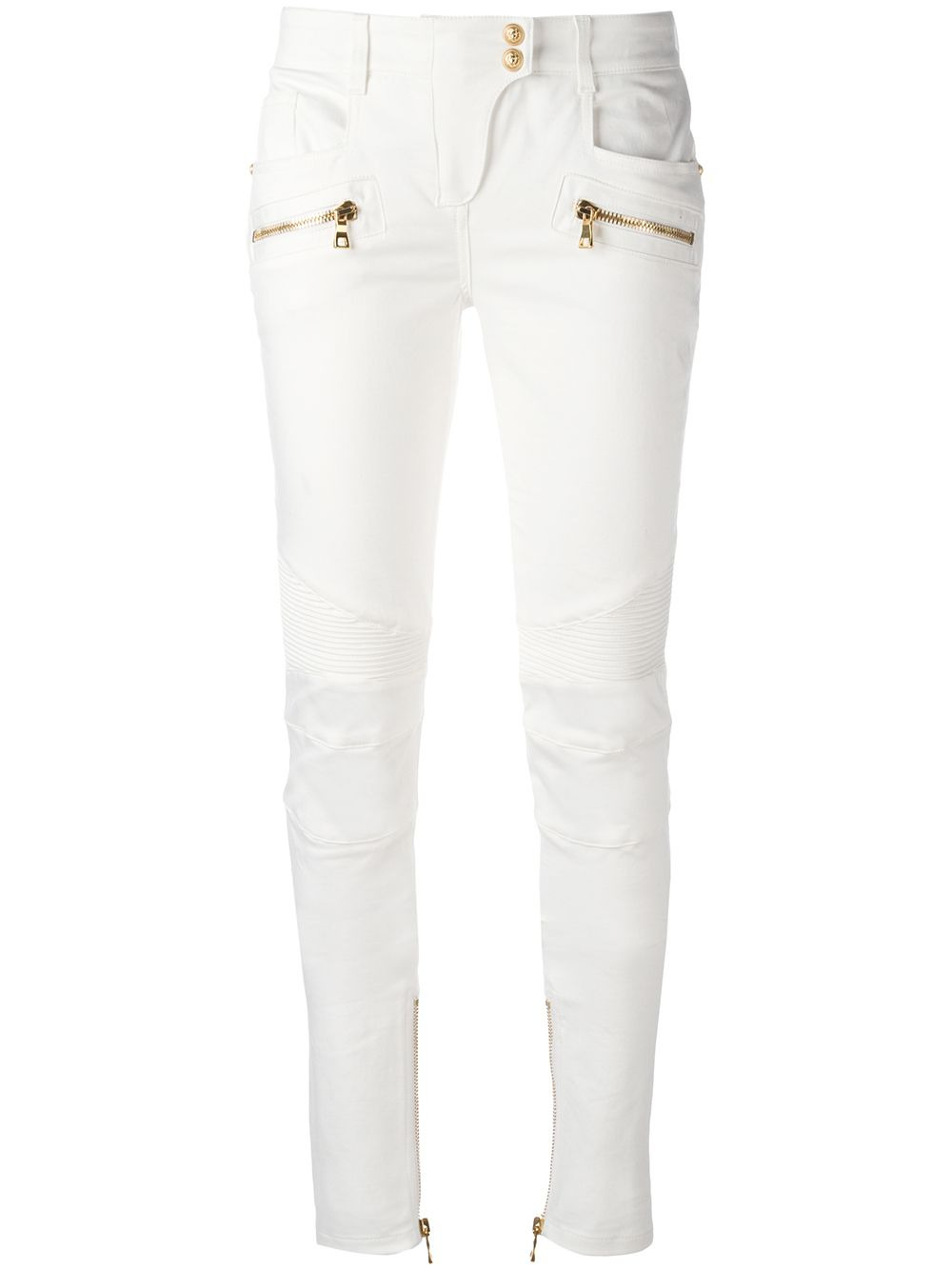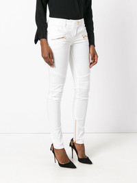 skinny biker trousers Optical white cotton blend skinny biker trousers from Balmain featuring a waistband with belt loops, a front button fastening, zipped cuffs, gold-tone hardware, a regular length and front zip pockets. Made in France Composition Cotton 95%, Polyethylene 5% SIZE & FIT Model measurements Height 5 ft 10 in(1.78 m) Bust/Chest 31.49 in(80 cm) Hips 37 in(94 cm) Waist 23.62 in(60 cm) Washing instructions Dry Clean Only