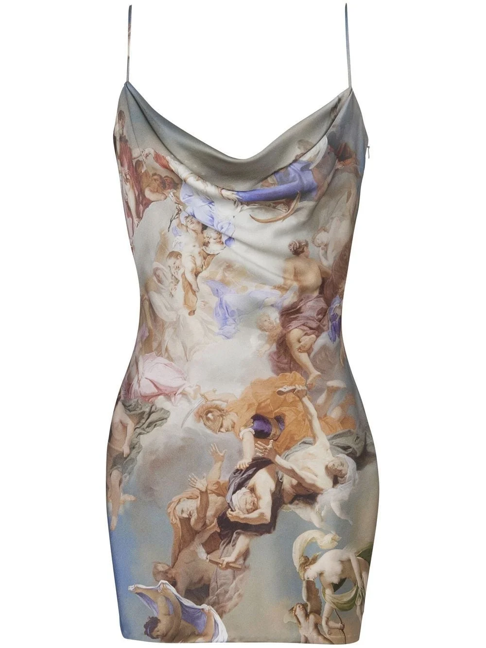 Sky-print cowl-neck minidress Strong, sculptural silhouettes, soft hues and Renaissance-inspired motifs take centre stage at Balmain for SS23. Detailed with a draped cowl neck, this blue mini dress is decorated throughout with printed artwork that recalls beloved styles of eras gone by. Highlights - Blue/multicolour - Satin finish - Painterly print - Draped detailing - Cowl neck - Concealed side zip fastening - Straight hem - Thigh-high Made in France Composition Viscose 100% SIZE & FIT Measurement HIPS 36.22 in(92 cm) LENGTH 32.67 in(83 cm) WAIST 29.13 in(74 cm) Washing instructions Specialist Cleaning