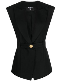 sleeveless single-breasted jacket Balmain's blazer showcases the brand's expert tailoring. This sleeveless iteration is decorated with a gold-tone medallion button at the waist tab - a house signature. Imported Composition Outer: Wool 100% Lining: Viscose 52%, Cotton 48% SIZE & FIT Model measurements Height 5 ft 10 in(1.79 m) Bust/Chest 31.49 in(80 cm) Hips 35.03 in(89 cm) Waist 23.62 in(60 cm) Measurement LENGTH 25.59 in(65 cm) WAIST 35.43 in(90 cm) BUST 31.49 in(80 cm) Shoulder Width 16.92 in(43 cm) Washing instructions Dry Clean Only