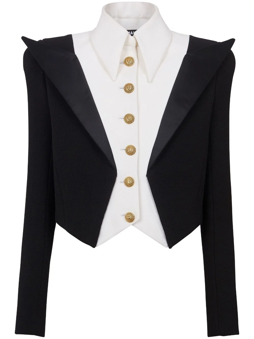 6-Button Spencer cropped jacket Highlights - Black/white - Virgin wool - Double layer - Front button fastening - Embossed gold-tone buttons - Wide peak lapels - Oversized pointed collar - Asymmetric hem - Cropped Made in France Composition Virgin Wool 100% Washing instructions Read Manufacturer Guidelines
