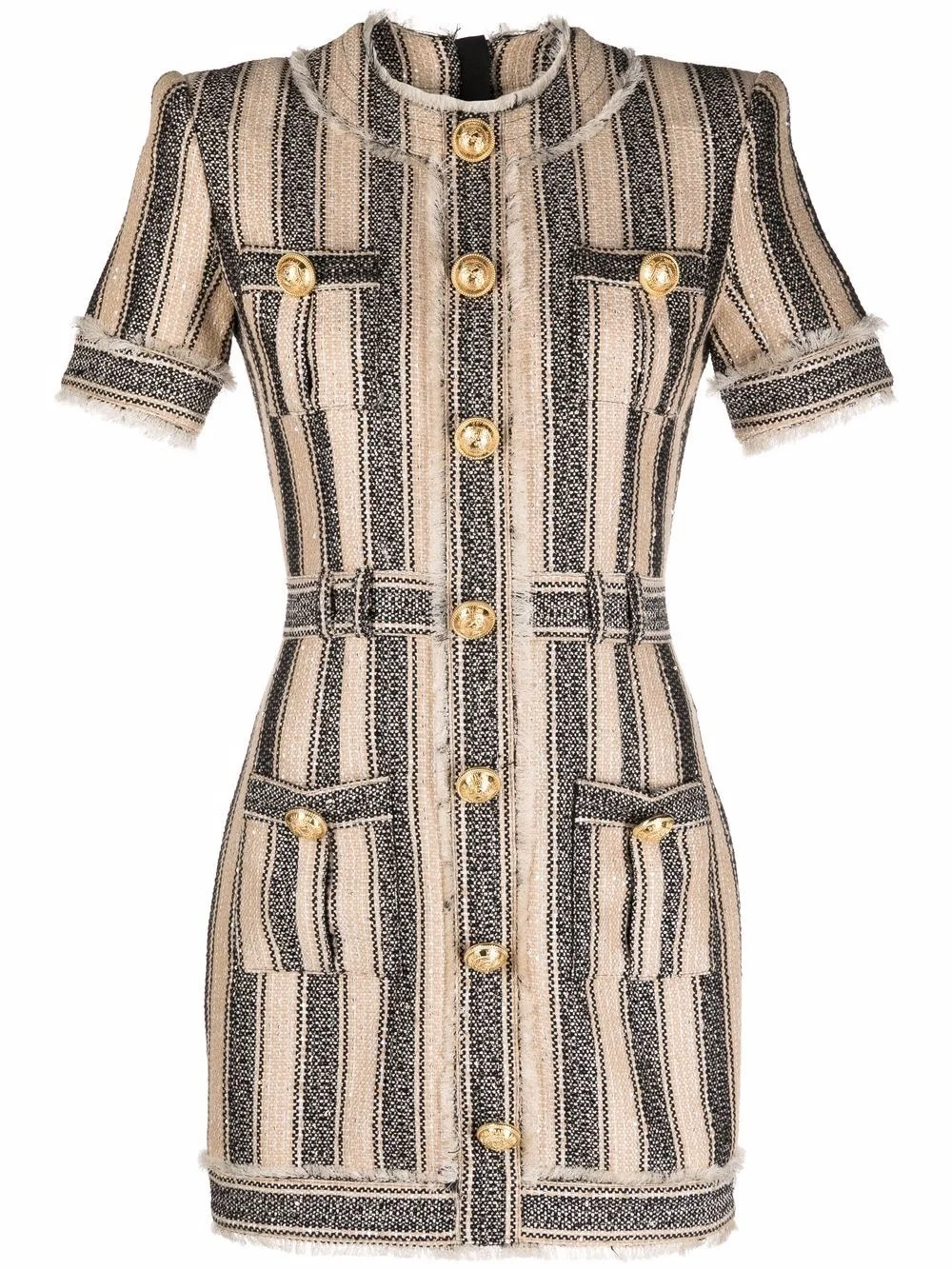 stiped pique dress Balmain's bodycon dresses have become a hallmark and this season is no exception. Case in point: this SS22 ecru and black cotton blend striped pique dress features the house's classic fitted short silhouette and is accented with signature gold-tone decorative buttons for a distinct finish. Imported Composition Cotton 38%, Polyester 35%, Metallized Polyester 11%, Acrylic 11%, other fibers 5% SIZE & FIT Model measurements Height 5 ft 10 in(1.78 m) Bust/Chest 33.07 in(84 cm) Hips 35.82 in(91 cm) Waist 25.98 in(66 cm) FittingInformation This piece fits true to size. We recommend you get your regular size Cut for a slim fit Made with a mid-weight non-stretch fabric Washing instructions Dry Clean Only