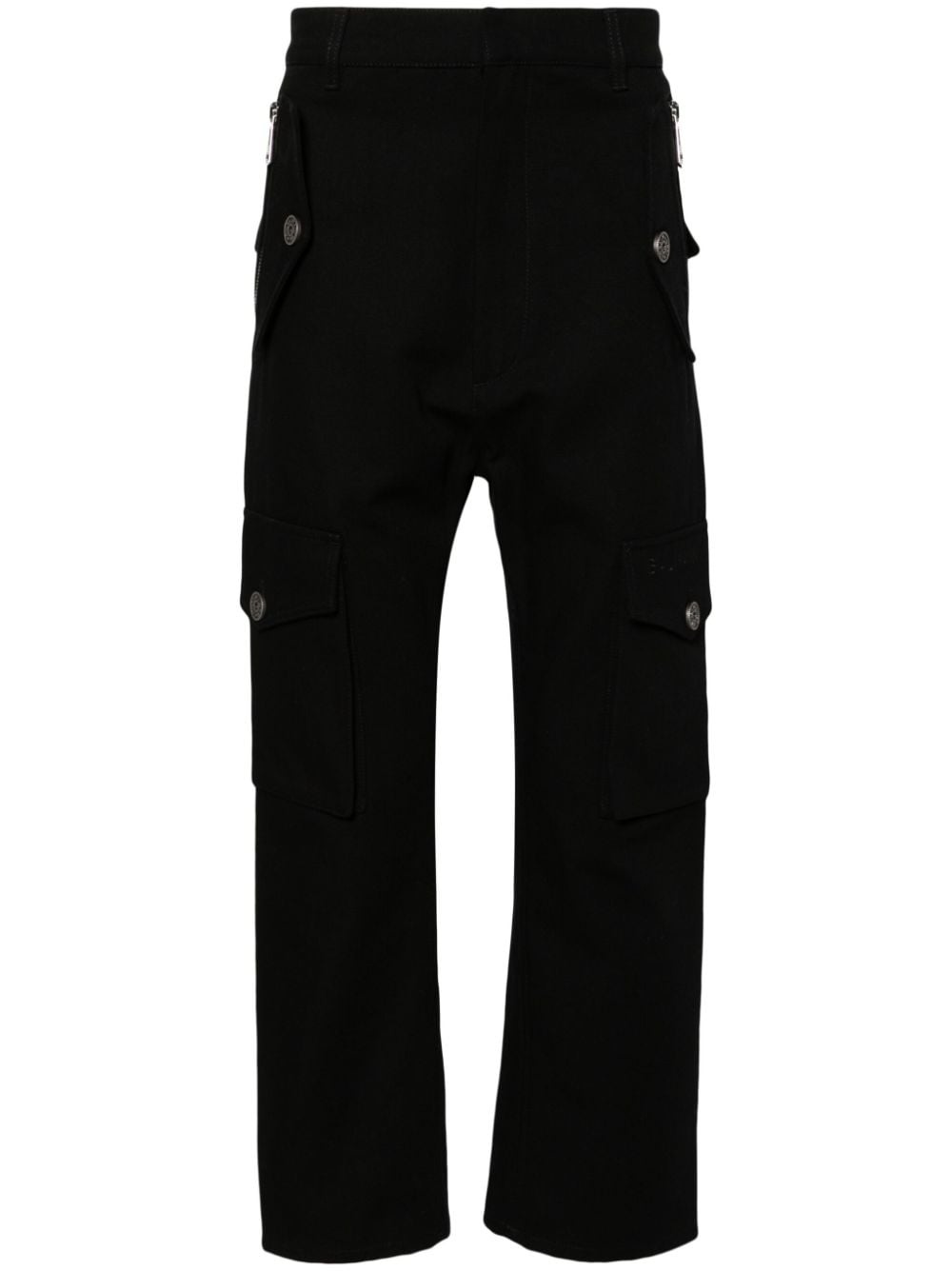straight-leg canvas cargo trousers Made from cotton, these trousers by Balmain combine comfort and style. Accented with multiple pockets, the cargo silhouette is decorated with silver-tone logo buttons. Highlights - Black - Cotton - Canvas - Logo-embossed buttons - Embroidered logo at the leg - Branded zip pullers - Straight leg - Mid-rise - Hook and zip fly fastening - Belt loops - Two side zip-fastening pockets - Two side faux flap pockets - Two side cargo pockets - Two rear button-fastening pockets Made in Italy Composition Lining: Polyester 65%, Cotton 35% Cotton 100% SIZE & FIT Model measurements Height 6 ft 2 in(1.88 m) Bust/Chest 36.61 in(93 cm) Hips 35.82 in(91 cm) Waist 27.95 in(71 cm) FittingInformation Designed for a straight-leg, allowing for an unrestricted and comfortable fit over the leg Made from a midweight non-stretch fabric This piece fits true to size – take your usual size Washing instructions Machine Wash