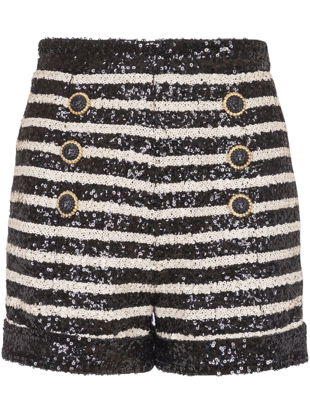 stripe-print rhinestone-embellished shorts Highlights - Black/white - Horizontal stripe print - Rhinestone embellishment - Decorative button detailing - Gold-tone hardware - Rear zip fastening - Branded zip puller - Straight hem Imported Composition Polyester 100%