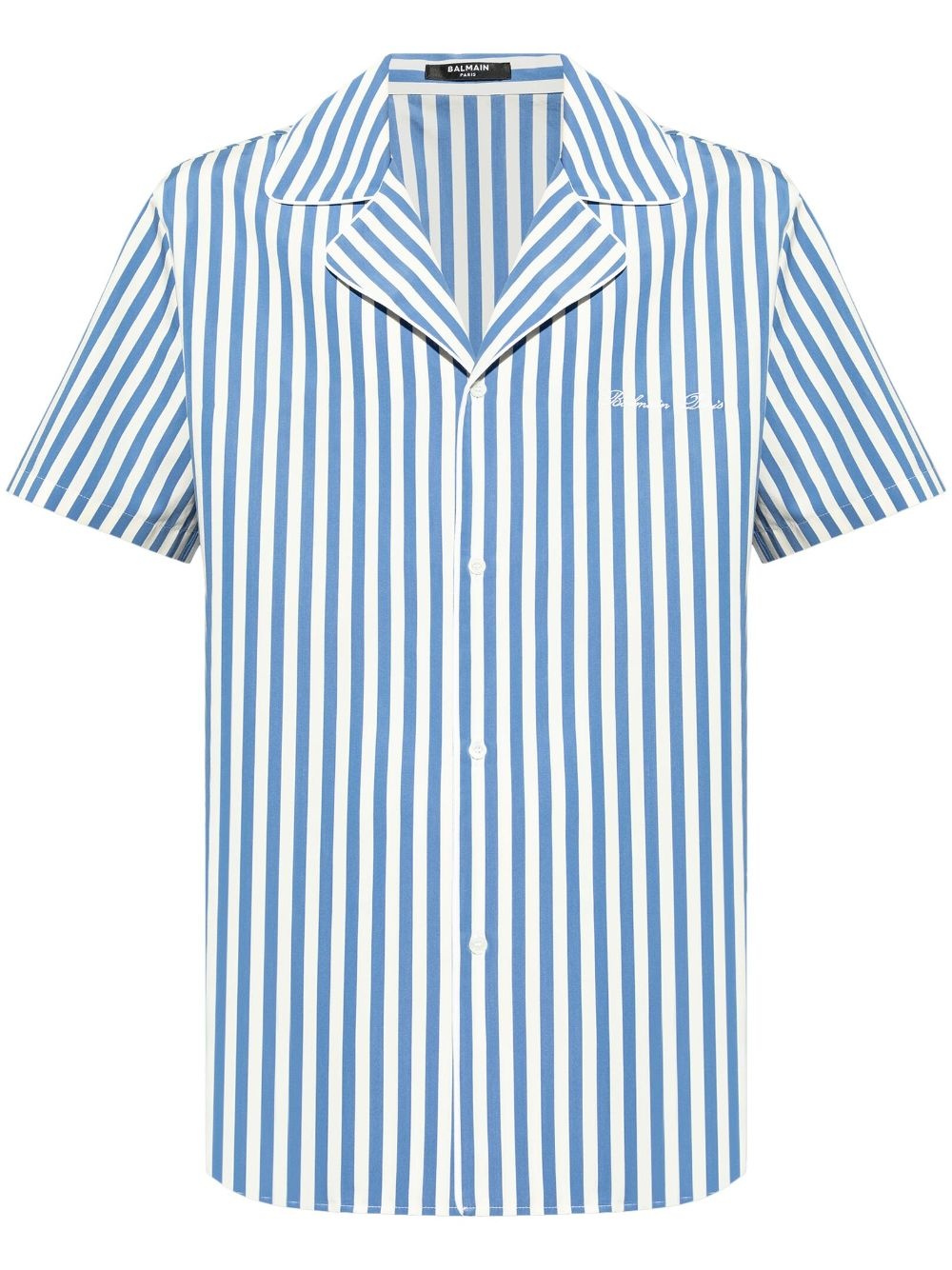 striped cotton shirt Highlights - Blue/white - Cotton - Poplin texture - Candy stripe pattern - Embroidered logo at the chest - Piped-trim detailing - Camp collar - Front button fastening - Short sleeves - Straight hem Made in Italy Composition Cotton 100%