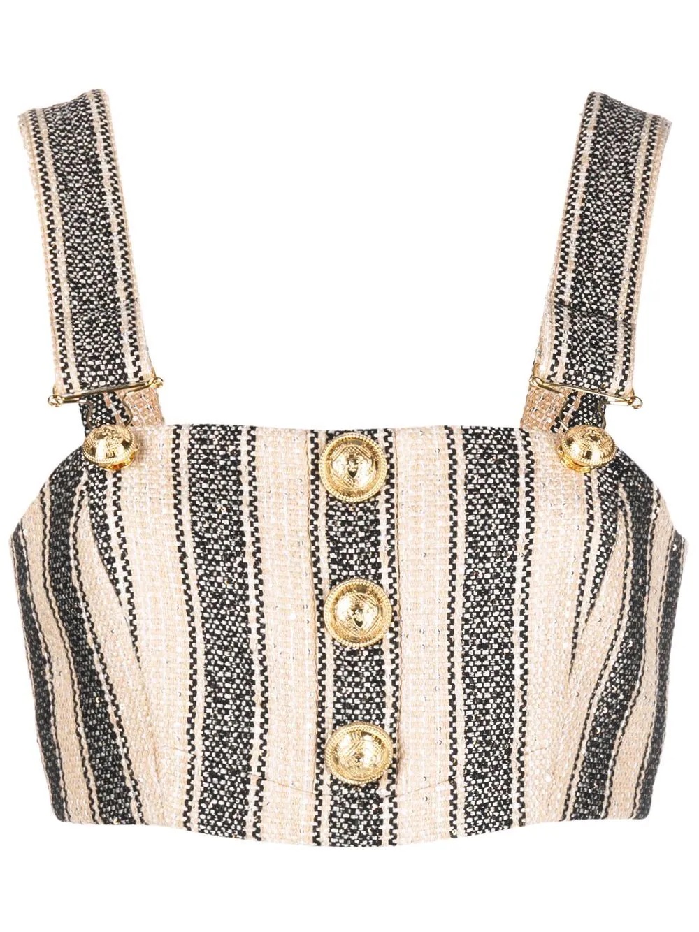 striped cropped top beige/black embossed gold-tone buttons vertical stripe pattern square neck square open back button-fastening straps cropped Imported Composition Cotton 38%, Polyester 35%, Acetate 11%, Metallized Polyester 11%, other fibers 5% SIZE & FIT Model measurements Height 5 ft 10 in(1.78 m) Bust/Chest 33.46 in(85 cm) Hips 36.22 in(92 cm) Waist 23.22 in(59 cm) FittingInformation This piece fits true to size. We recommend you get your regular size Cut for a slim fit Made with a mid-weight non-stretch fabric Washing instructions Dry Clean Only