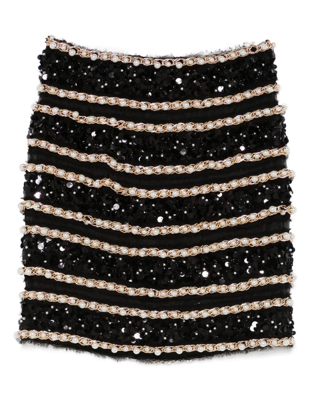 striped mini skirt Highlights - Black - Faux-pearl embellishment - Rear zip fastening Made in France Composition Faux Pearl 100%, Metal 100%, Polyester 100% SIZE & FIT FittingInformation This mini-length skirt is intended to be worn just below the waist Made from a midweight non-stretch fabric, this piece offers minimal elasticity when worn Washing instructions Dry Clean Only