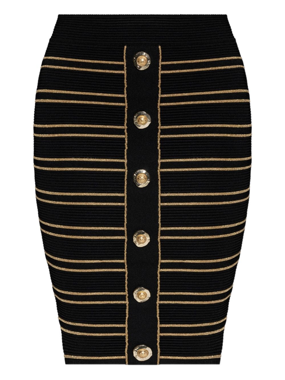 striped pencil skirt Highlights - Black - Horizontal stripe pattern - Decorative button detailing - Ribbed knit - High waist Made in France Composition Viscose 100% Washing instructions Dry Clean Only