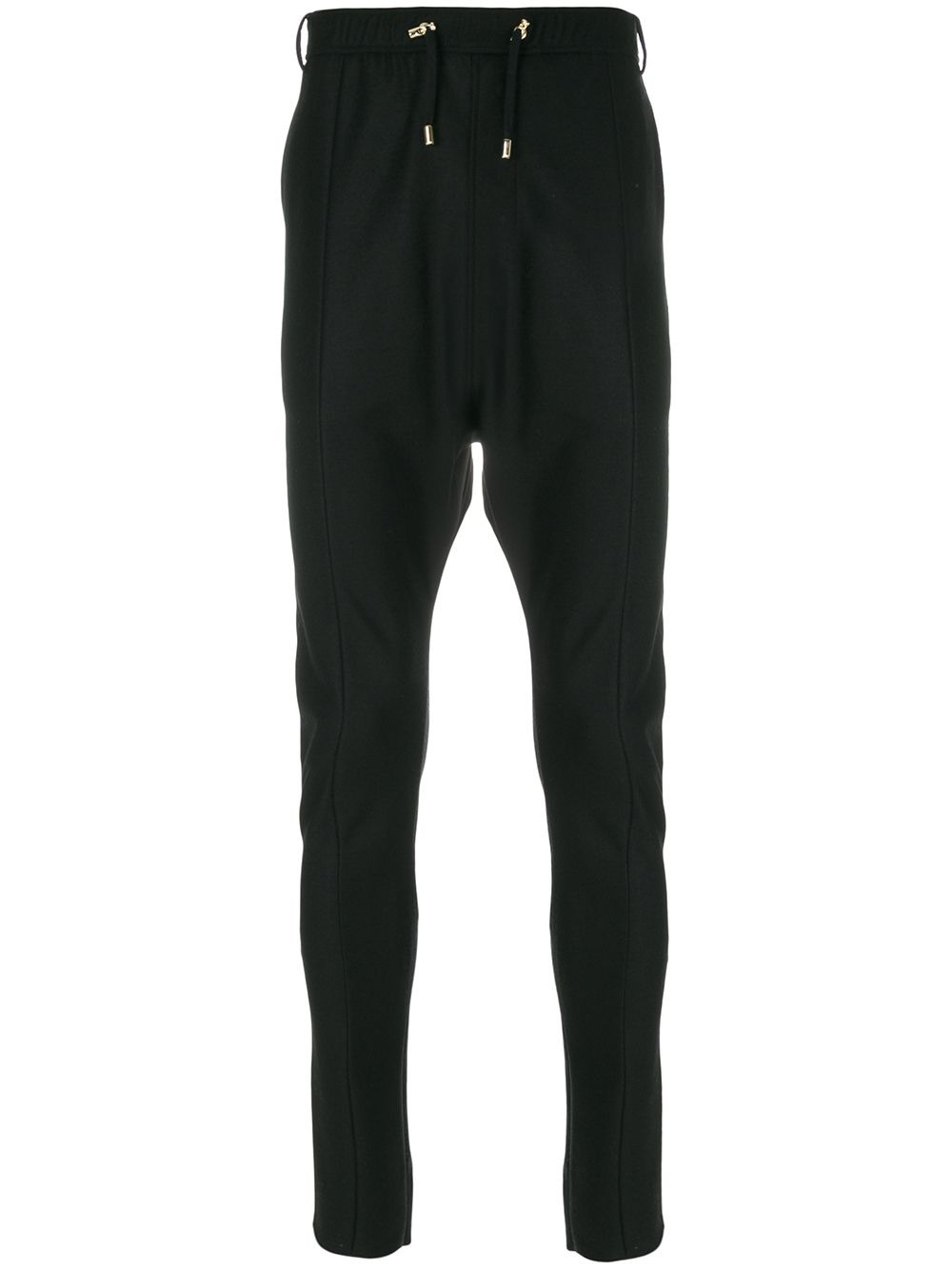 tailored joggers Olivier Rousteing continues to introduce his youthful energy to classic silhouettes for Balmain’s Autumn/Winter '17 collection. Expect expert craftsmanship and premium materials blended with sports-inspired elements and a contemporary finish. Fashioned in Italy from a sumptuous blend of black cotton and wool, these tailored joggers feature a comfortable, elasticated waistband with a drawstring fastening, belt loops, rear slit pockets, a signature slim fit and central leg pleats for a more refined look. Made in Italy Composition Outer: Wool 85%, Polyamide 15% Lining: Cotton 100% SIZE & FIT Model measurements Height 6 ft 1 in(1.86 m) Bust/Chest 35.43 in(90 cm) Hips 35.43 in(90 cm) Waist 29.92 in(76 cm)