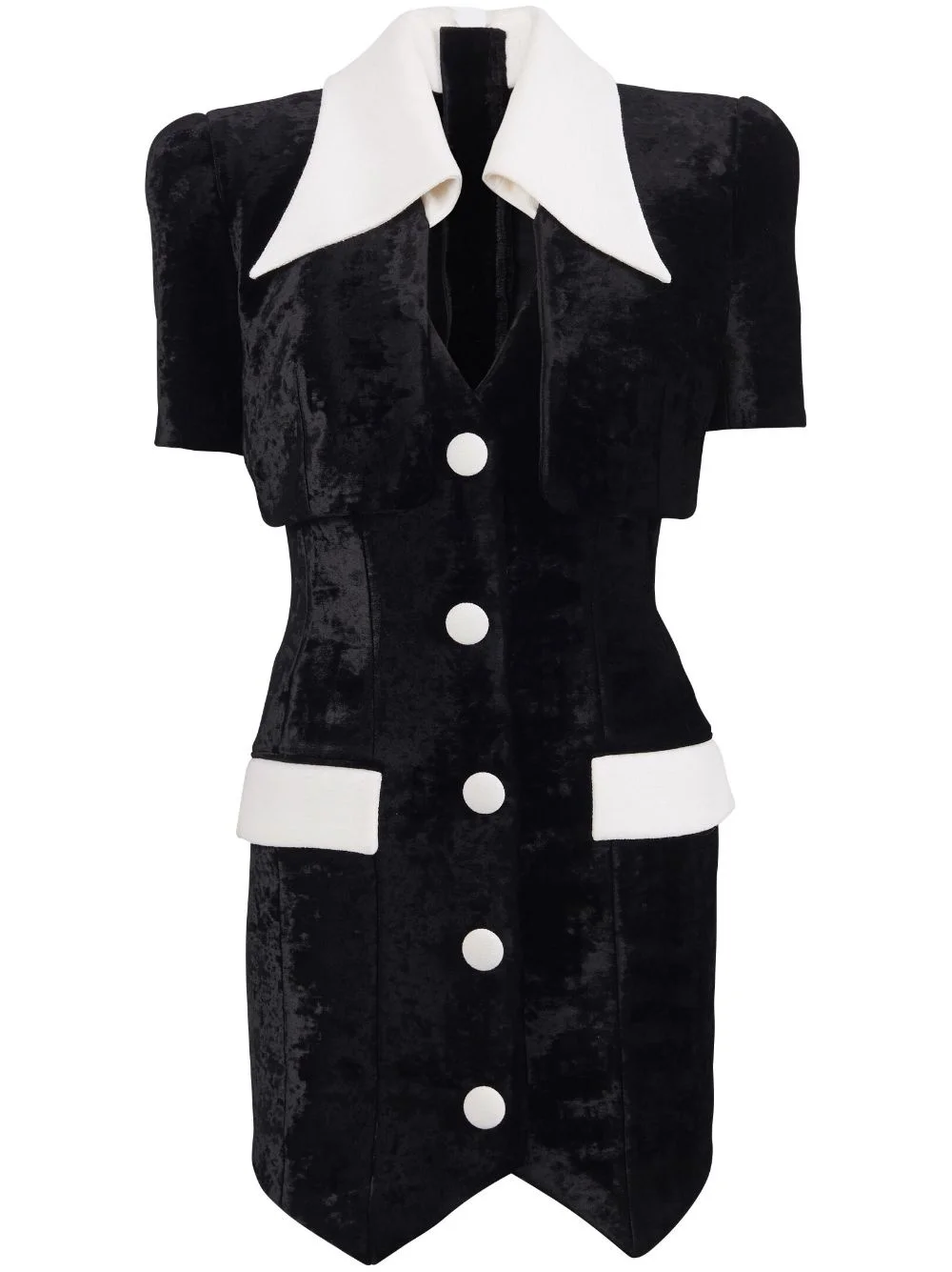 tailored velvet minidress Expert tailoring and striking silhouettes are Balmain's forte, and this black minidress encapsulates both. It's cut from tactile velvet with an exaggerated point collar and a bolero-style overlay. White crepe trims and self-covered buttons add visual and textural contrast. Highlights - Black/white - Straight-point collar - Short sleeves - Front button fastening Made in France Composition Polyester 52%, Viscose 48% Washing instructions Specialist Cleaning