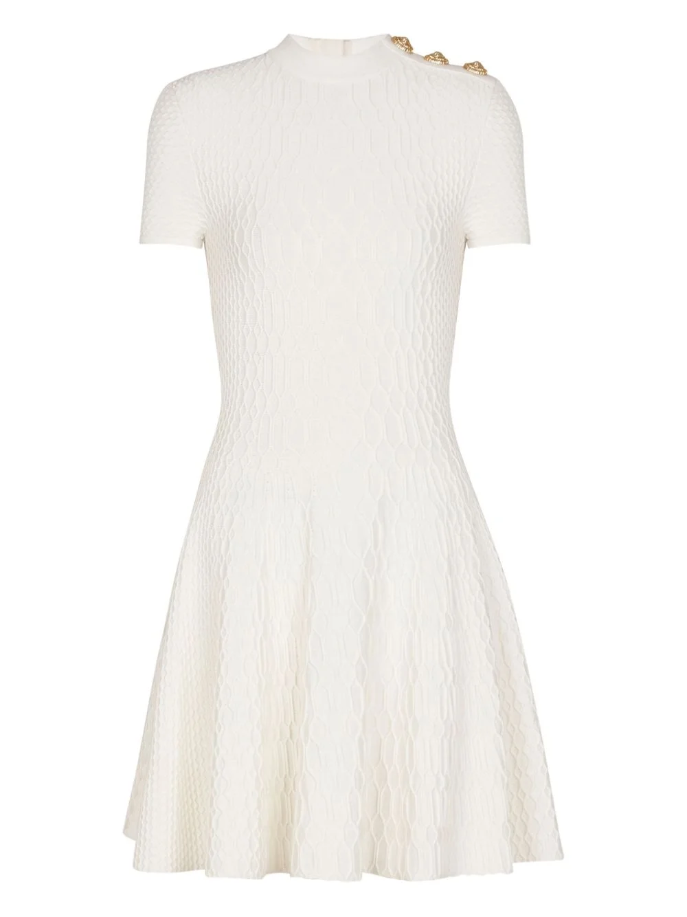 textured -knit flared mini dress Highlights - Off-white - Textured knit - Flared hem - Short sleeves - Mock neck - Gold buttons Made in Italy Composition Viscose 85%, Polyester 15% Washing instructions Read Manufacturer Guidelines
