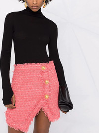 textured-tweed mini skirt Balmain's signature logo-embossed gold-tone buttons decorate the front of this tweed mini skirt from the label's AW21 collection. Imbued with Parisian elegance, the Italian-crafted piece is cut to a mid-rise silhouette and boasts an asymmetric hem. Imported Composition Cotton 59%, Polyamide 29%, Viscose 12% SIZE & FIT Model measurements Height 5 ft 11 in(1.8 m) Bust/Chest 31.49 in(80 cm) Hips 35.82 in(91 cm) Waist 24.8 in(63 cm) Measurement HIPS 39.37 in(100 cm) WAIST 31.49 in(80 cm) Washing instructions Dry Clean Only