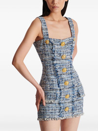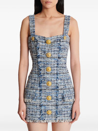 tweed mini dress Highlights - Blue-grey - Cotton blend - Tweed - Rear zip fastening - Two flat shoulder straps - Bustier-style neckline - Embossed gold-tone buttons - Frayed detailing - Fitted waistline - Straight hem Imported Composition Cotton 78%, Acrylic 10%, Viscose 8%, Polyamide 3%, Polyester 1%