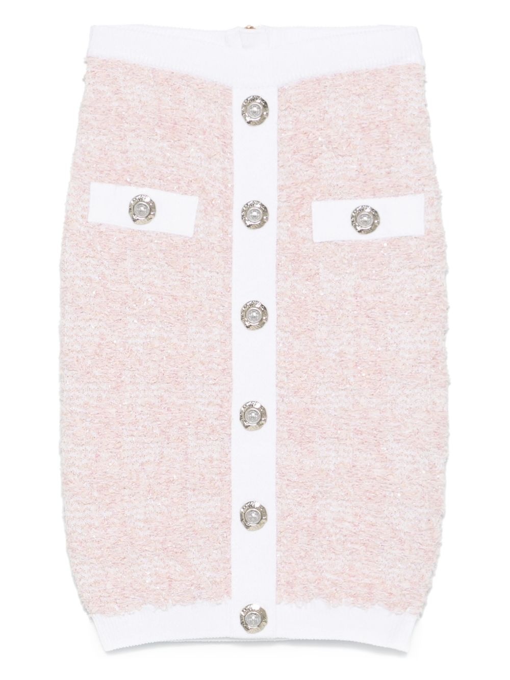 tweed pencil skirt Highlights - Rose pink - Exposed rear zip fastening - Decorative button detailing - Ribbed trim Made in France Composition Polyamide 66%, Viscose 16%, Cotton 13%, Polyester 3%, Metallized Polyester 2% SIZE & FIT Model measurements Height 5 ft 9 in(1.75 m) Bust/Chest 34.64 in(88 cm) Hips 36.61 in(93 cm) Waist 26.37 in(67 cm) FittingInformation This midi-length skirt is intended to be worn high on the waist The elasticated waist allows for a comfortable fit Made with a midweight knit, this piece offers some stretch