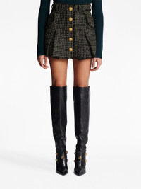 tweed pleated mini skirt Balmain reflects its love for vintage aesthetics in this AW23 mini skirt. Featuring a tweed construction, the pleated silhouette is punctuated with embossed gold-tone buttons that emphasise the brand's iconic style. Highlights - Black/gold-tone - Tweed - High waist - Belt loops - Front button fastening - Embossed gold-tone buttons - Two side pouch pockets - Rear zip fastening - Pleated skirt - Thigh-length Imported Composition Outer: Viscose 48%, Polyester 34%, Cotton 13%, Polyamide 5% Lining: Viscose 52%, Cotton 48% SIZE & FIT Measurement HIPS 42.51 in(108 cm) LENGTH 18.5 in(47 cm) WAIST 32.28 in(82 cm)