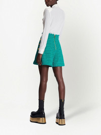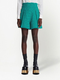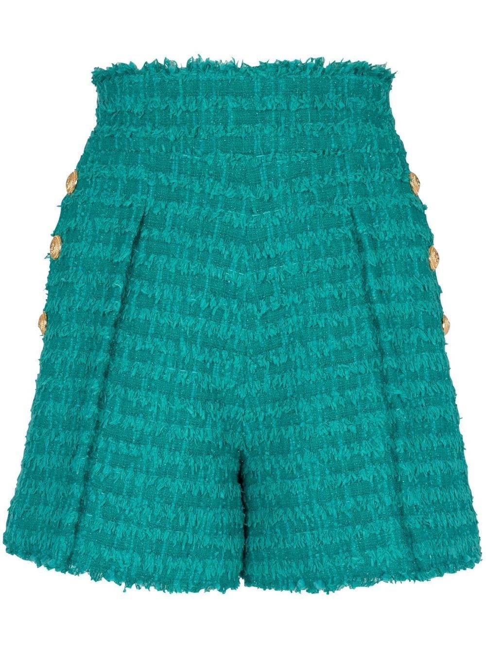 tweed tailored shorts Highlights - Teal green - Tweed - Pleat detailing - Decorative button detailing - High waist - Rear zip fastening - Two side slit pockets - Thigh-length Imported Composition Body: Polyamide 50%, Cotton 30%, Acrylic 19%, Metal 1% SIZE & FIT Measurement FRONT RISE 14.96 in(38 cm) HIPS 40.94 in(104 cm)