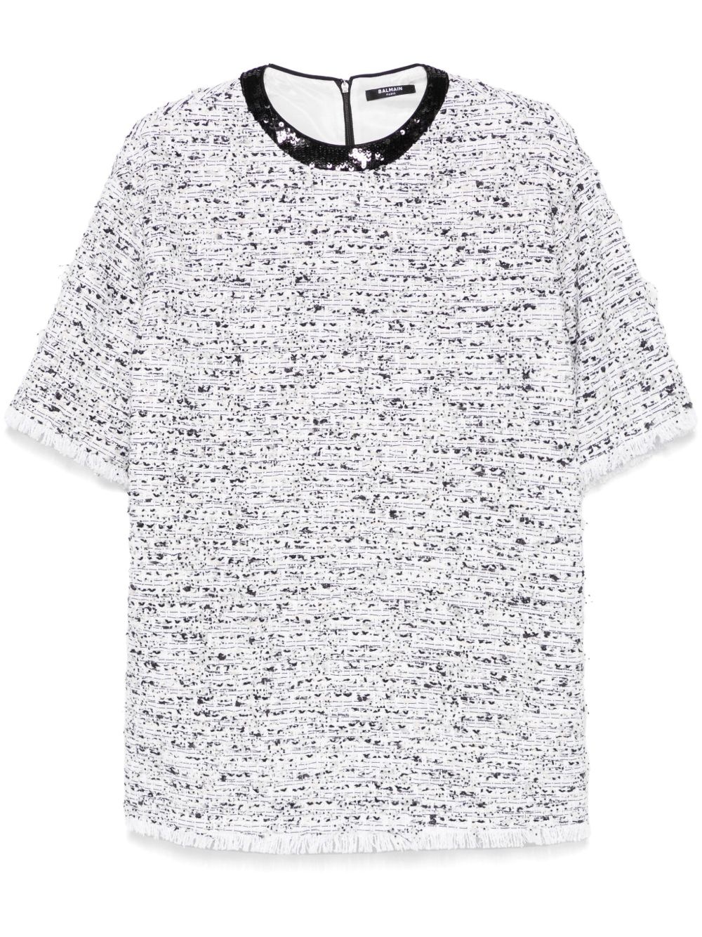 tweed top Highlights - White - Concealed rear zip fastening - Crew neck - Short sleeves - Frayed edge Imported Composition Outer: Cotton 42%, Polyamide 24%, Acrylic 17%, Viscose 10%, Polyester 7% Lining: Viscose 52%, Cotton 48% SIZE & FIT Model measurements Height 5 ft 10 in(1.78 m) Bust/Chest 32.67 in(83 cm) Hips 35.43 in(90 cm) Waist 23.22 in(59 cm) FittingInformation Designed to be unstructured, offering a loose fit throughout Made from a midweight non-stretch fabric