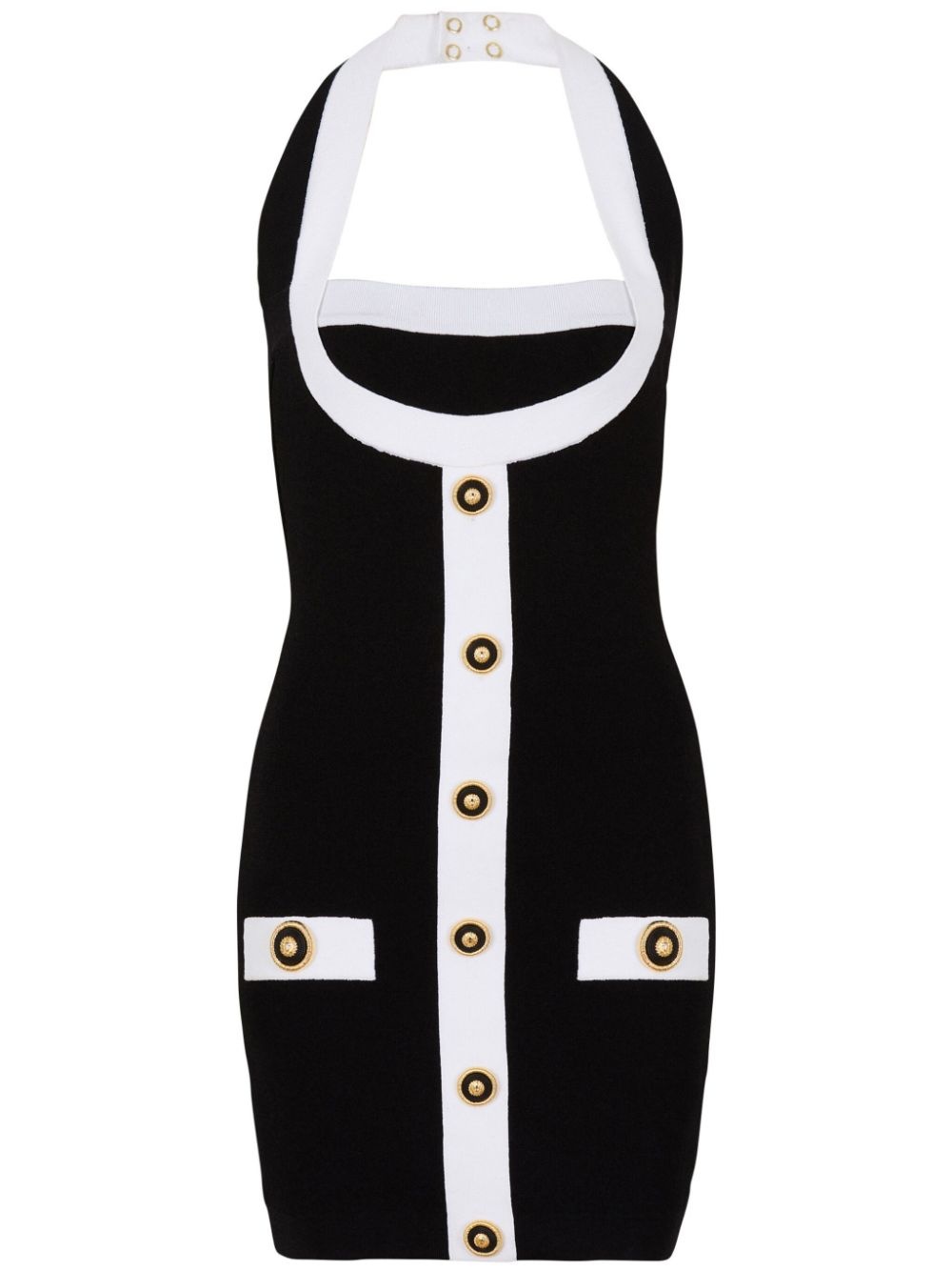 two-tone halterneck dress Highlights - Black/white - Knitted construction - Two-tone design - Rear zip fastening - Halterneck - Square neck - Sleeveless - Decorative button detailing - Faux pocket detail - Straight hem - Thigh-length Made in France Composition Viscose 85%, Polyester 15%