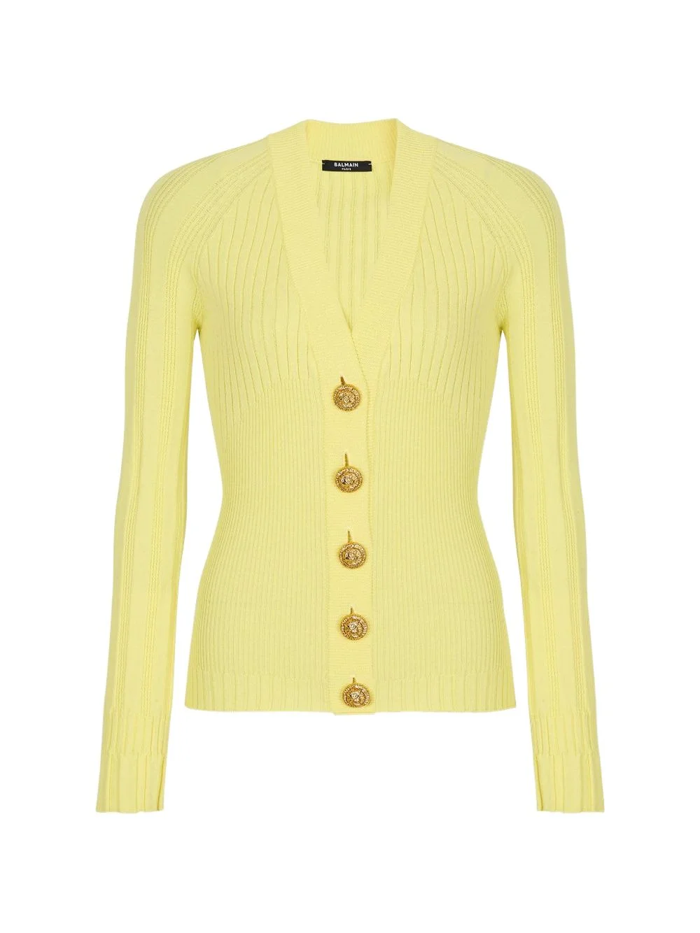 V-neck buttoned cardigan Highlights - Yellow - Ribbed knit - Button fastening - V-neck - Long sleeves Made in France Composition Viscose 75%, Polyester 25% Washing instructions Read Manufacturer Guidelines
