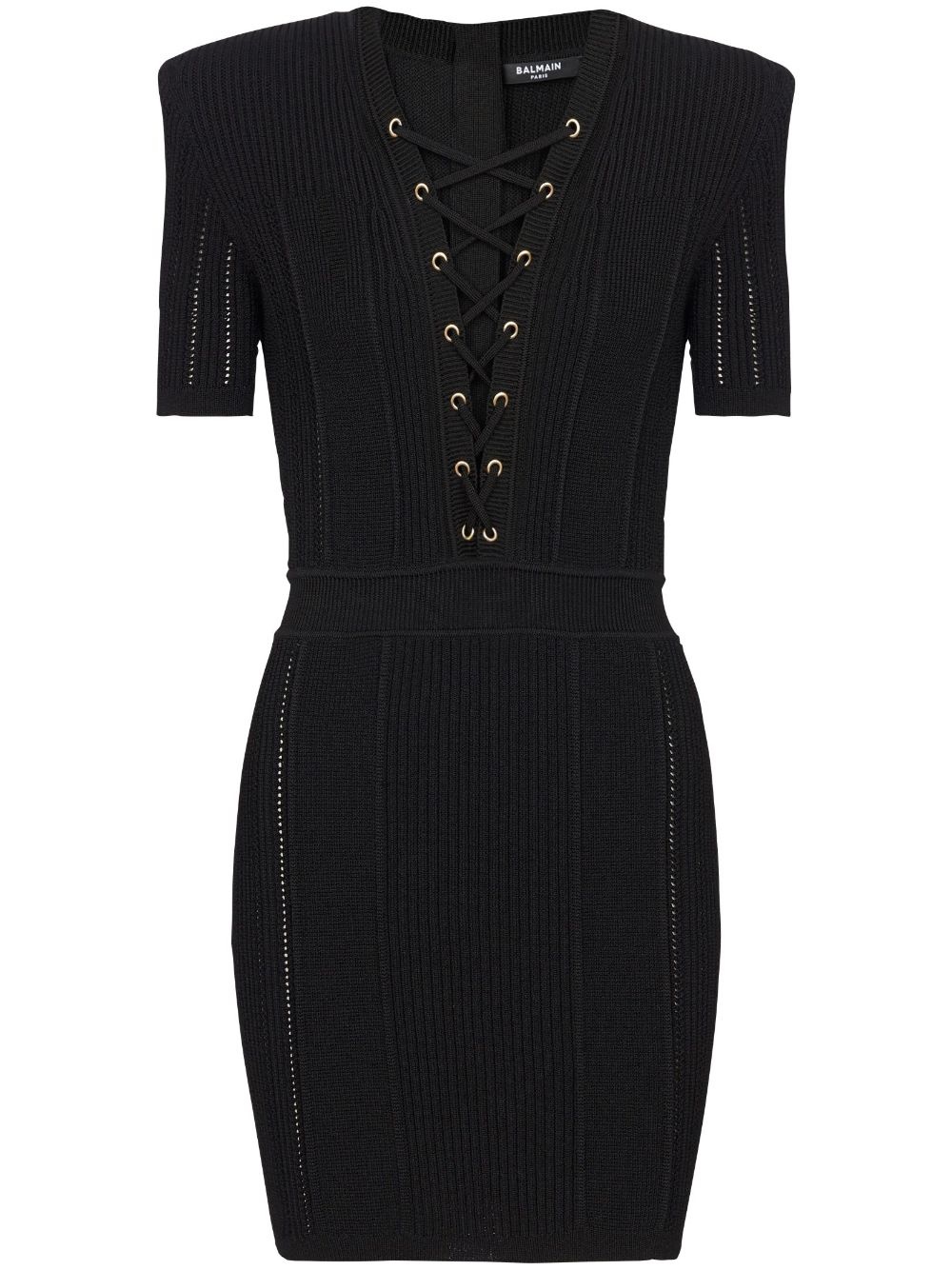 V-neck lace-up minidress Highlights - Black - Gold-tone hardware - Eyelet detailing - Lace detailing - V-neck - Rear zip fastening - Short sleeves - Straight hem - Thigh-length Made in Italy Composition Viscose 84%, Polyester 16% SIZE & FIT FittingInformation Designed for a close fit throughout The internal shoulder pads offer a structured shape Made with a midweight knit, this piece offers some stretch Washing instructions Read Manufacturer Guidelines