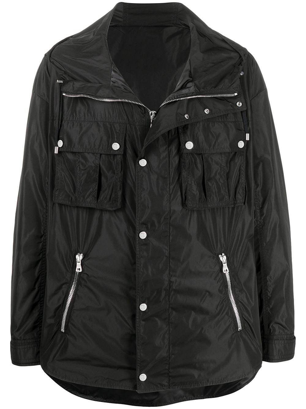 zip-front drawstring jacket Come rain or come shine, you'll want to keep this raincoat from Balmain handy. In a black hue and water-resistant construction, you'll be singing in the rain. Just don't upset the commuters. Imported Composition Outer: Polyester 100% Lining: Polyester 100% SIZE & FIT Model measurements Height 6 ft 1 in(1.85 m) Bust/Chest 35.82 in(91 cm) Hips 37.79 in(96 cm) Waist 29.13 in(74 cm) FittingInformation This piece fits true to size. We recommend you get your regular size Cut for a loose fit Made with a mid-weight non-stretch fabric Washing instructions Dry Clean Only