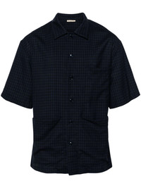 checked camp-collar shirt Highlights - Navy blue - Virgin wool blend - Interlock twill weave - Check pattern - Camp collar - Front button fastening - Short sleeves - Chest patch pocket - Two front patch pockets - Straight hem Made in Italy Composition Virgin Wool 98%, Elastane 2% SIZE & FIT Model measurements Height 6 ft 2 in(1.87 m) Bust/Chest 36.22 in(92 cm) Hips 37 in(94 cm) Waist 27.95 in(71 cm) FittingInformation Designed to be unstructured, offering a loose fit throughout Made from a lightweight stretch fabric, this piece offers elasticity and flexibility when worn This piece fits true to size – take your usual size