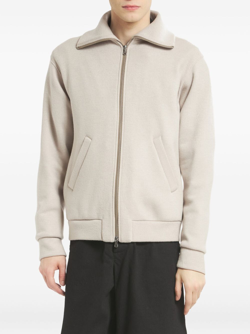 high-neck zip-fastening sweatshirt Highlights - Cream - Virgin wool-blend - Zip closure - High collar - Welt pockets - Ribbed cuffs and hem Made in Italy Composition Virgin Wool 98%, Polyamide 2%
