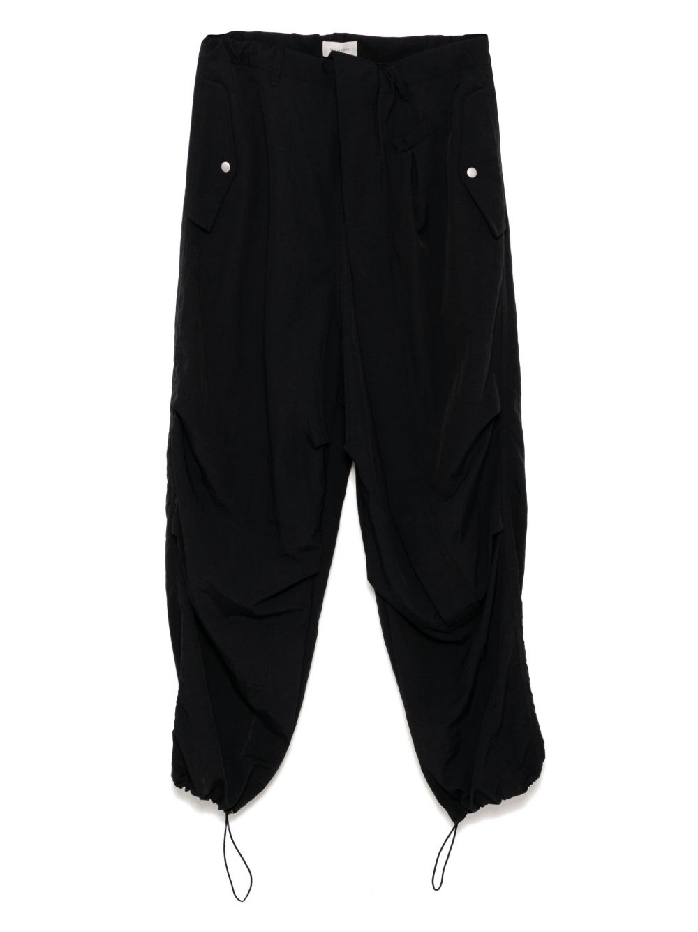 Parachute trousers Highlights - Black - Front button and zip fastening - Drawstring waist - Belt loops - Two side button-fastening pockets Imported Composition Nylon 100% SIZE & FIT Model measurements Height 6 ft 2 in(1.88 m) Bust/Chest 34.25 in(87 cm) Hips 34.64 in(88 cm) Waist 26.77 in(68 cm) FittingInformation Designed for a relaxed tapered leg, allowing a comfortable loose fit above the knee with a closer fit towards the calves Adjust this piece’s waistband to your preference using the drawstring Made from a midweight non-stretch fabric Washing instructions Dry Clean Only