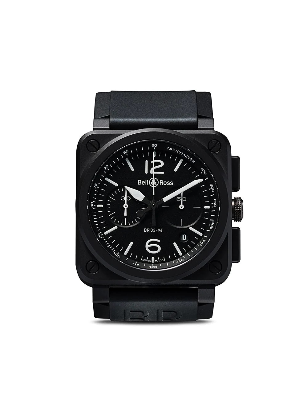 BR 03-94 Black Matte 42mm Bell & Ross are known for drawing inspiration from their military heritage, paying tribute to timepieces used on land, at sea or in the air. Hand-crafted in La-Chaux-de-Fonds, their BR 03-94 collection references WW2 cockpit board instruments with square cases and a high level of precision. The BR 03-94 Black Matte 42mm features a calibre BR-CAL.301 mechanical automatic movement, a black dial with SuperLuminova-filled indices and numerals for optimal visibility, a matte black ceramic 42mm case, an anti-reflective sapphire crystal face, a 100m water resistance and a black rubber strap with a PVD-coated steel buckle, which can be interchanged for a resilient canvas variation. Functions include hours, minutes, small seconds at 3 o’clock, a date indication, an elapsed time chronograph, a 30-min timer at 9 o’clock, central chronograph seconds and a minute track on the flange. This item comes with a standard 2-year international warranty from the brand. Imported Composition Outer: Rubber 100%, Steel 100%, ceramic 100% Lining: Canvas 100% SIZE & FIT Model measurements Height 6 ft 2 in(1.87 m) Bust/Chest 37.79 in(96 cm) Hips 37.79 in(96 cm) Waist 30.31 in(77 cm) Measurement Strap width 0.98 in(25 mm) Minimum strap length 7.08 in(18 cm) Case thickness 0.51 in(13 mm) Maximum strap length 8.85 in(22.5 cm) Case size 1.65 in(42 mm)