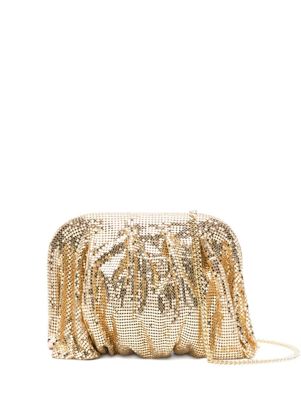 chainmail clutch Highlights - Gold-tone - Pleated detailing - Clasp closure - Chain strap - Draped design Made in Italy Composition Outer: glass 100%, Brass 100% SIZE & FIT Model measurements Height 5 ft 10 in(1.79 m) Bust/Chest 31.88 in(81 cm) Hips 35.43 in(90 cm) Waist 23.62 in(60 cm) Measurement DEPTH 1.96 in(5 cm) HEIGHT 4.33 in(11 cm) WIDTH 5.9 in(15 cm)