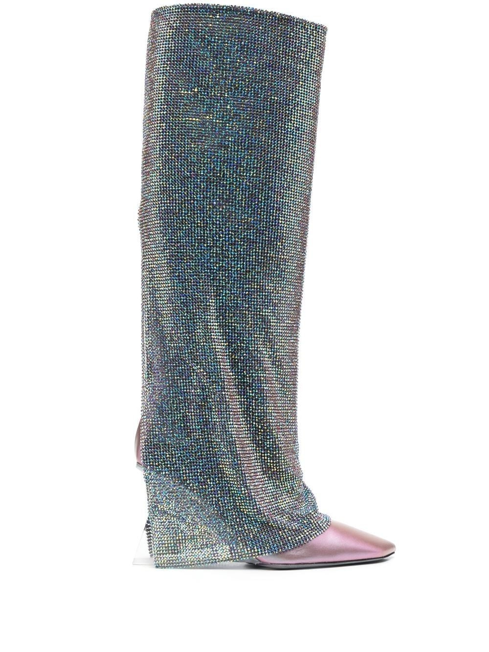 Christine 90mm boots blue calf leather/crystal crystal embellishment draped detailing knee-length pointed toe high heel Made in Italy Composition Lining: Calf Leather 100% Outer: Calf Leather 100%, Crystal 100% Sole: Rubber 100%, Calf Leather 100% SIZE & FIT Measurement CIRCUMFERENCE 15.74 in(40 cm) HEEL 3.54 in(9 cm) HEIGHT 15.74 in(40 cm)