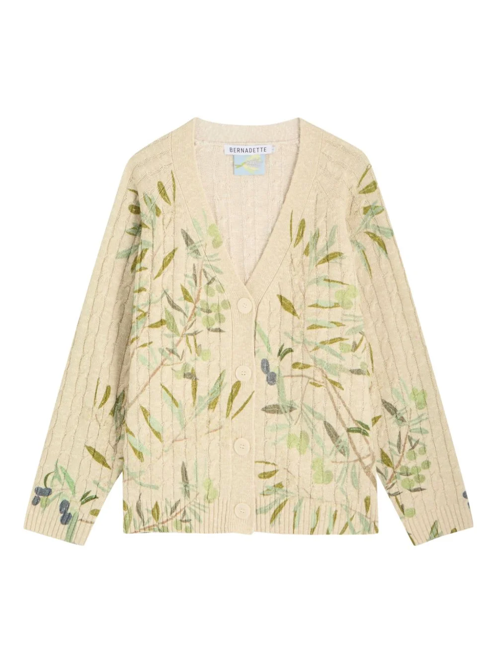 floral-print cable-knit cardigan Highlights - Beige - Olive tree print - Cable knit - Front button fastening - V-neck - Long sleeves - Ribbed trims Imported Composition Cotton 50%, Linen/Flax 33%, Silk 17% Washing instructions Machine Wash
