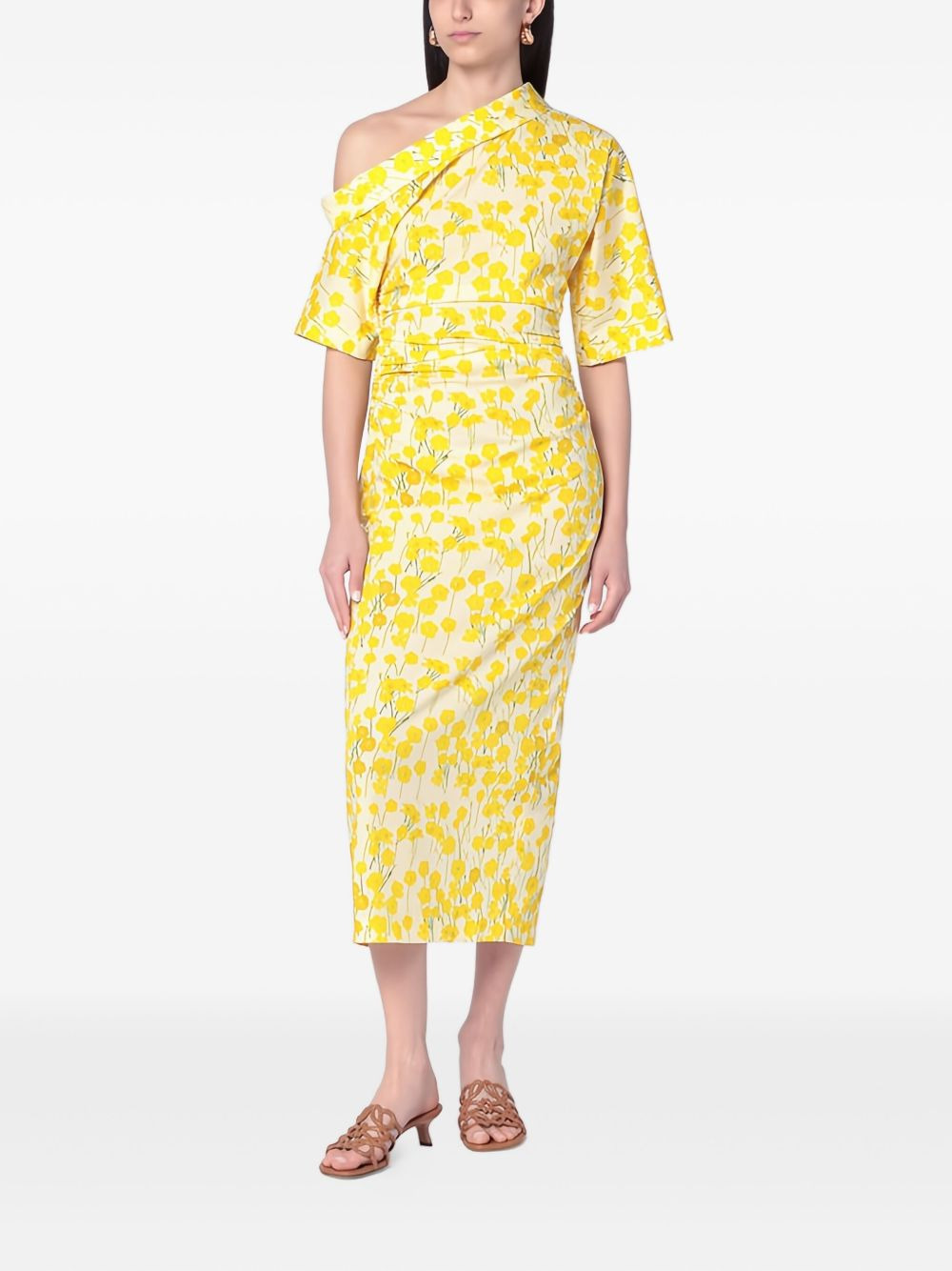floral-print one-shoulder midi dress Highlights - Yellow - Floral pattern - One-shoulder neckline - Short sleeves - Gathered waist Imported Composition Cotton 97%, Elastane 3% Washing instructions Read Manufacturer Guidelines