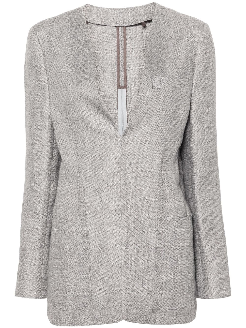 x Zegna collarless V-neck blazer Highlights - Medium grey - Wool blend - Interwoven design - Collarless - V-neck - Long sleeves with buttoned cuffs - Chest welt pocket - Dart detailing - Two side patch pockets - English rear vents - Unlined - Straight hem - Concealed rear zip fastening Imported Composition Wool 56%, Cotton 22%, Alpaca Wool 15%, Silk 7% SIZE & FIT Model measurements Height 5 ft 9 in(1.76 m) Bust/Chest 31.88 in(81 cm) Hips 35.43 in(90 cm) Waist 24.8 in(63 cm) FittingInformation Designed for a relaxed fit, this piece allows for comfort and movement when worn Made from a midweight non-stretch fabric This piece fits true to size – take your usual size