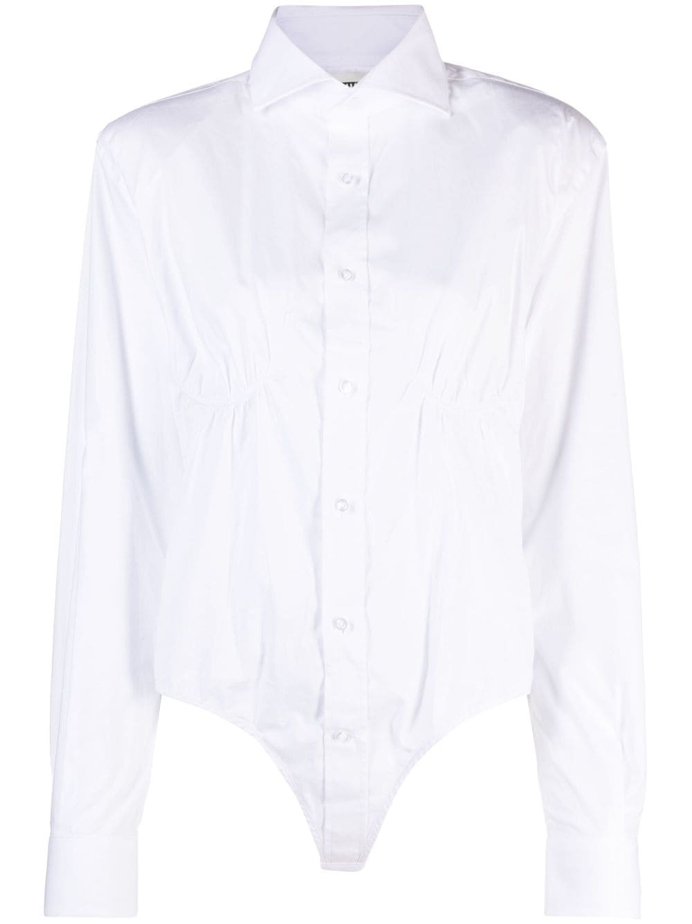 underwired cotton bodysuit Highlights - White - Cotton - Poplin texture - Spread collar - Front button fastening - Shoulder pads - Long sleeves - Buttoned cuffs - Underwire cup - High cut - This product is crafted from upcycled materials so the one you receive may differ slightly from the item pictured. - Just a reminder that this piece must be tried on over your own garments. Imported Composition Cotton 100% SIZE & FIT Model measurements Height 5 ft 11 in(1.8 m) Bust/Chest 31.49 in(80 cm) Hips 35.82 in(91 cm) Waist 24.8 in(63 cm) Washing instructions Dry Clean Only