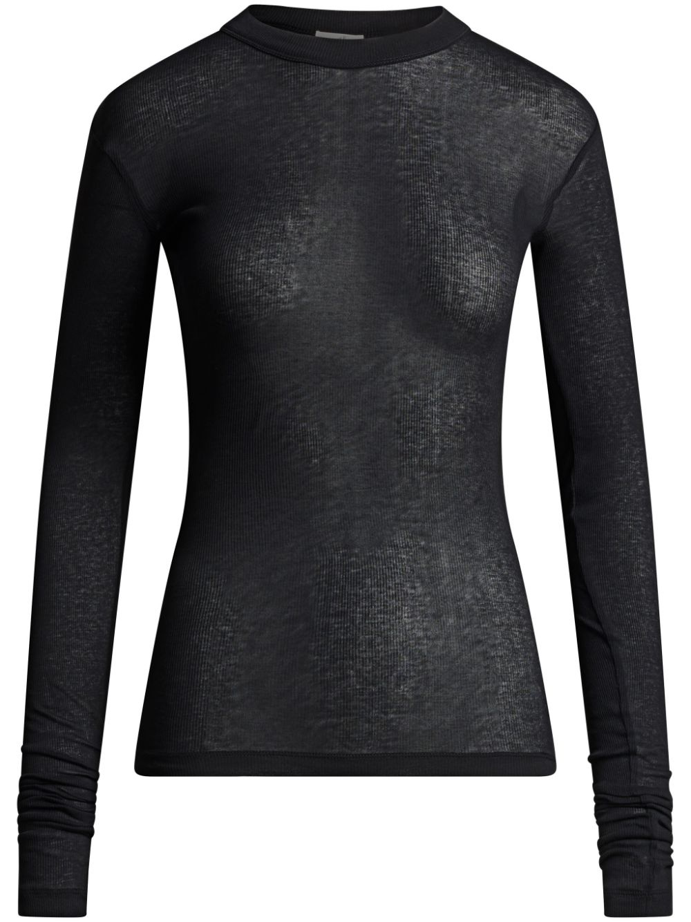 semi-sheer cotton T-shirt Highlights - Black - Cotton - Jersey texture - Semi-sheer construction - Ribbed edge - Crew neck - Long sleeves - Straight hem Imported Composition pure cotton 100% SIZE & FIT FittingInformation Designed for a close fit throughout Made from a lightweight non-stretch fabric, this piece offers minimal elasticity when worn This piece fits true to size – take your usual size Washing instructions Read Manufacturer Guidelines