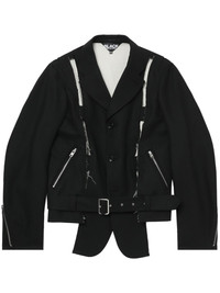 cut-out detailed biker jacket Highlights - Black - Wool blend - Notched lapels - Cut-out detailing - Front zip fastening pockets - Belted waist - Long sleeves - Asymmetric hem - When buying this unisex item, keep in mind that it is graded in standard men's sizing. Imported Composition Polyester 65%, Wool 35%
