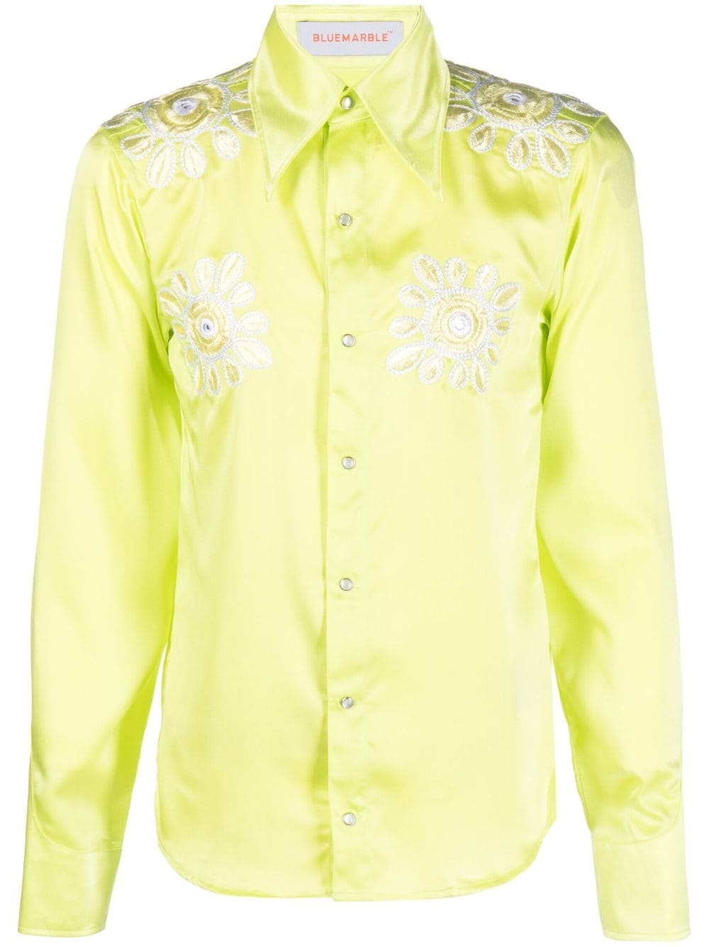 floral-embroidery satin shirt Highlights - Lime green - Satin finish - Floral embroidery - Pointed flat collar - Front press-stud fastening - Long sleeves - Buttoned cuffs - Curved hem Made in Italy Composition Polyester 100% SIZE & FIT Model measurements Height 6 ft 2 in(1.87 m) Bust/Chest 38.18 in(97 cm) Hips 36.61 in(93 cm) Waist 29.13 in(74 cm) FittingInformation Designed for a slim fit, offering a comfortable fit that sits just away from the body Made from a lightweight non-stretch fabric This piece fits true to size – take your usual size