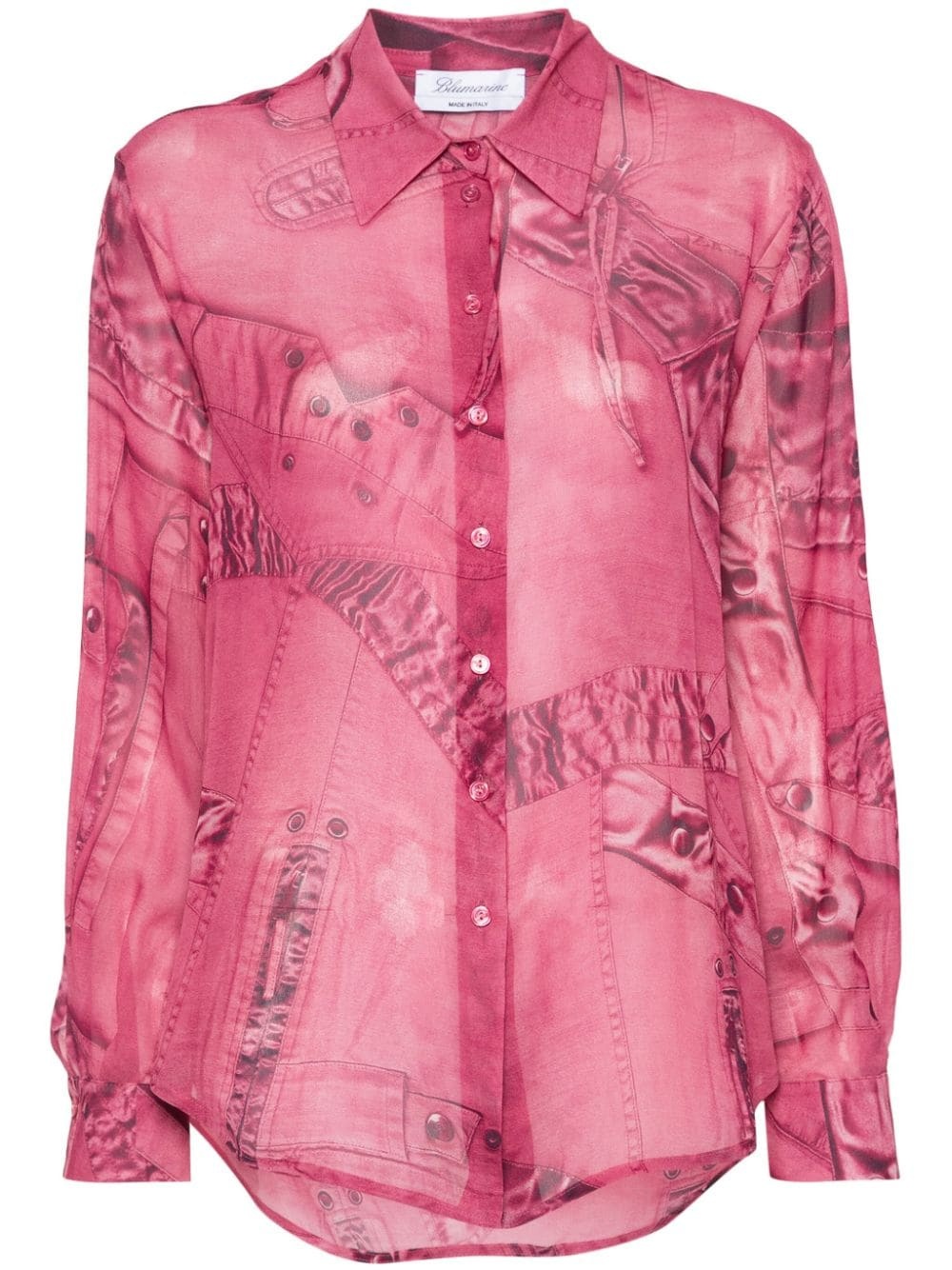 all-over graphic-print shirt Highlights - Dark pink - Crepe de chine - Semi-sheer construction - All-over graphic print - Pointed flat collar - Long sleeves - Buttoned-cuff sleeves - Curved hem - Front button fastening Made in Italy Composition Viscose 100% SIZE & FIT Model measurements Height 5 ft 10 in(1.78 m) Bust/Chest 31.49 in(80 cm) Hips 37 in(94 cm) Waist 23.62 in(60 cm) Measurement CHEST 37.79 in(96 cm) SLEEVE LENGTH 22.83 in(58 cm) HIPS 38.58 in(98 cm) LENGTH 25.59 in(65 cm) WAIST 36.22 in(92 cm) FittingInformation Designed to be unstructured, offering a loose fit throughout Made from a lightweight non-stretch fabric This piece fits true to size – take your usual size Washing instructions Machine Wash